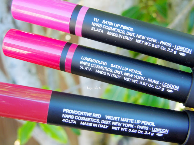I went from a non jumbo lip pencil fan to a complete lover of Provocative Red, that's saying NARS is definitely doing something right, right?! As for Luxembourg and Yu, I am not too crazy about the colours and the texture, both are too creamy and I mostly dislike that it stains heavily and is hard to remove.